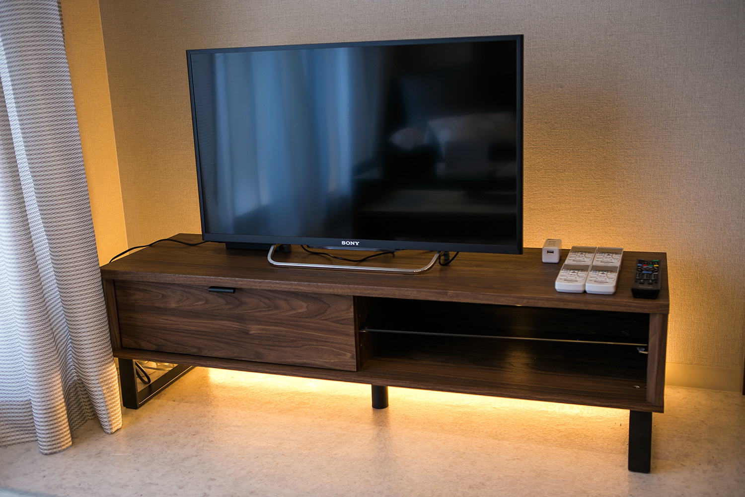 テレビの大きさに合わせたものを用意しましょう。埃が溜まりにくく掃除しやすいものがおススメです。 省スペース化のためにテレビを壁掛けにする方法もあります(その場合、下地補強や取付金具設置、電源工事が必要になってきます。)
