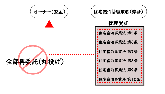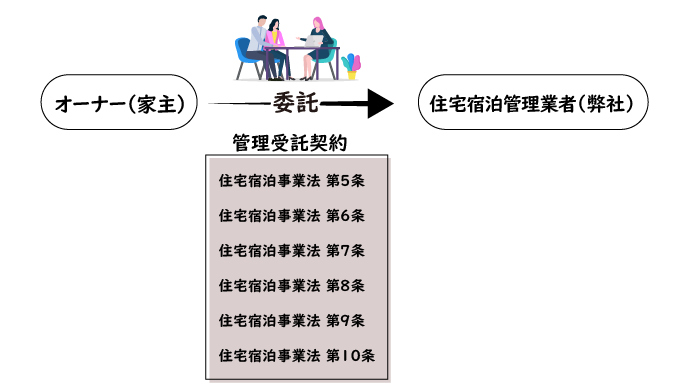 そもそも住宅宿泊事業を始めるにあたり、オーナー(家主)と住宅宿泊管理業者(弊社)で締結する管理受託契約では、住宅宿泊事業法 第5条~第10条の業務を委託するという内容になっております。