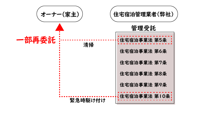 そのため管理受託契約の書面上に、例えば「第5条の宿泊者の衛生確保の措置(清掃)と第10条の苦情等の処理(緊急時駆け付け)を〇〇に再委託する」と記載して締結する流れになります。
